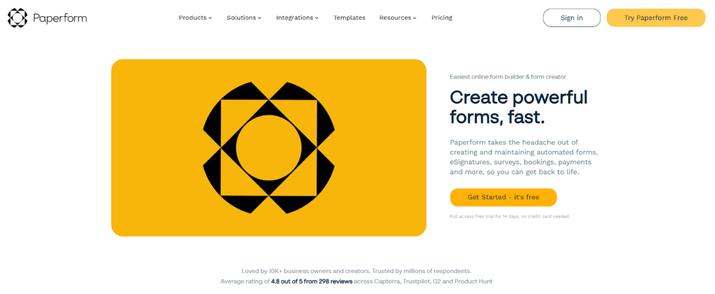 Paperform combines the simplicity of form building with the design flexibility of landing pages. It allows businesses to create visually appealing, interactive forms that support media embedding, payment collection, and automation.