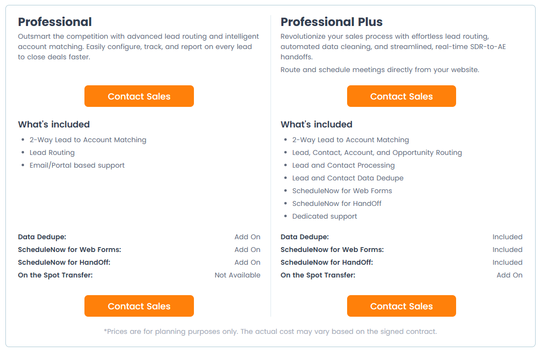 - Professional Plus Plan – Designed for larger teams with advanced needs, this plan offers tools like lead, contact, and opportunity routing, data deduplication, and Schedule Now for web forms and handoff. Dedicated support is also included, with On-the-Spot Transfer available as an add-on.