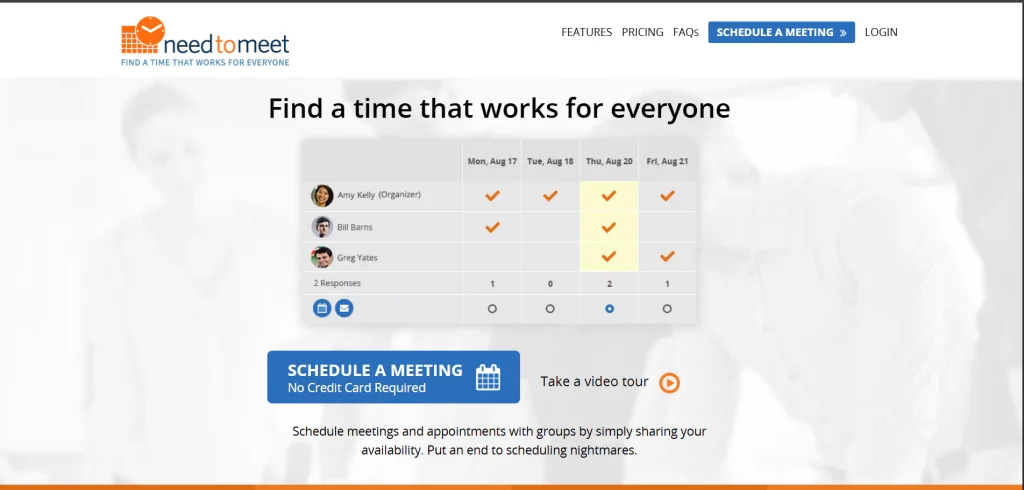 Need To Meet is a simple scheduling tool designed for group meetings. It allows users to create custom event pages where participants select their availability.